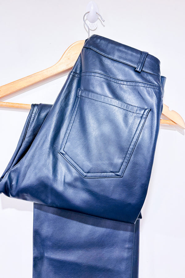 Adopte une allure audacieuse avec ce pantalon noir en faux cuir taille haute Dynamite. Sa coupe ajustée met la silhouette en valeur, tandis que sa texture lisse ajoute une touche chic et moderne. Une pièce seconde main parfaite pour un look de soirée ou un style urbain raffiné.